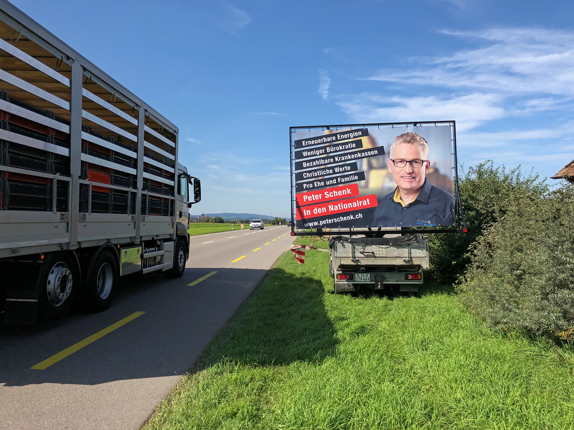 Zwischen Sulgen und Bürglen mit quergestellter Werbetafel.